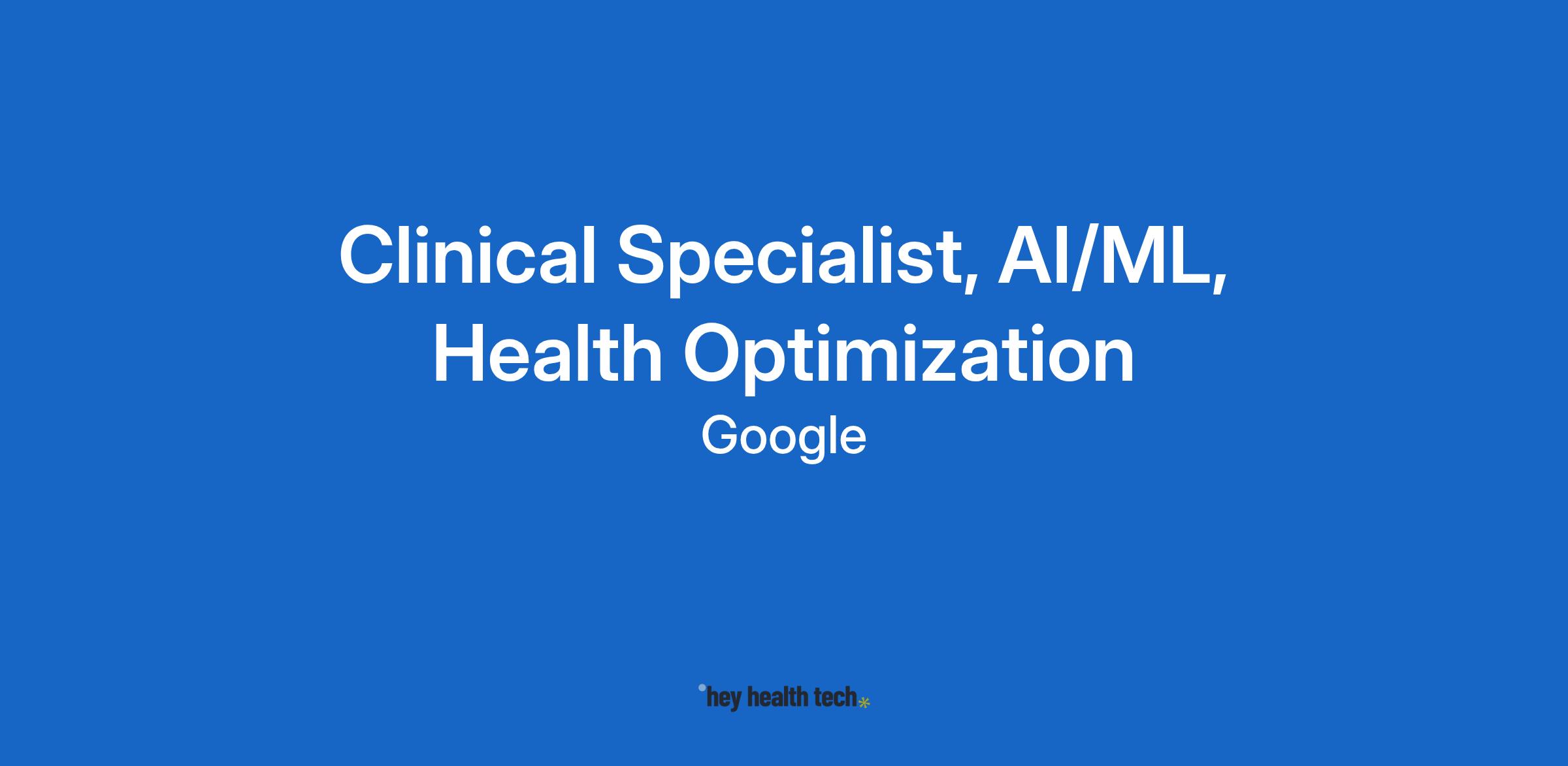 As a Clinical Specialist for Health Optimization, you'll be an influential contributor, embedding human context into the early stages of Artificial Intelligence (AI) development to support research programs and products. With a data-driven, proactive approach, you will guide the creation and evaluation of GenAI solutions to achieve meaningful health impact on a global scale.You will leverage your clinical and AI skills, knowledge of the research-to-product life-cycle, and communication and leadership skills to shape the design and implementation of GenAI solutions. You will be experienced in health AI research, development, and deployment, with the ability to work cross-functionally with non-clinical teams (e.g., engineering, product management, UX/UXR, legal, and regulatory affairs). You will have a demonstrable background as a professional with recognized skills in a clinical or advanced health research field and experience evaluating AI models.Google for Health is a company-wide effort to help billions of people be healthier. We work toward this vision by meeting people in their everyday moments and empowering them to stay healthy and partnering with care teams to provide more accurate and accessible care. Our teams are applying our expertise and technology to improve health outcomes globally – with high-quality information and tools to help people manage their health and wellbeing, solutions to transform care delivery, research to catalyze the use of artificial intelligence for the screening and diagnosis of disease, and data and insights to the public health community.