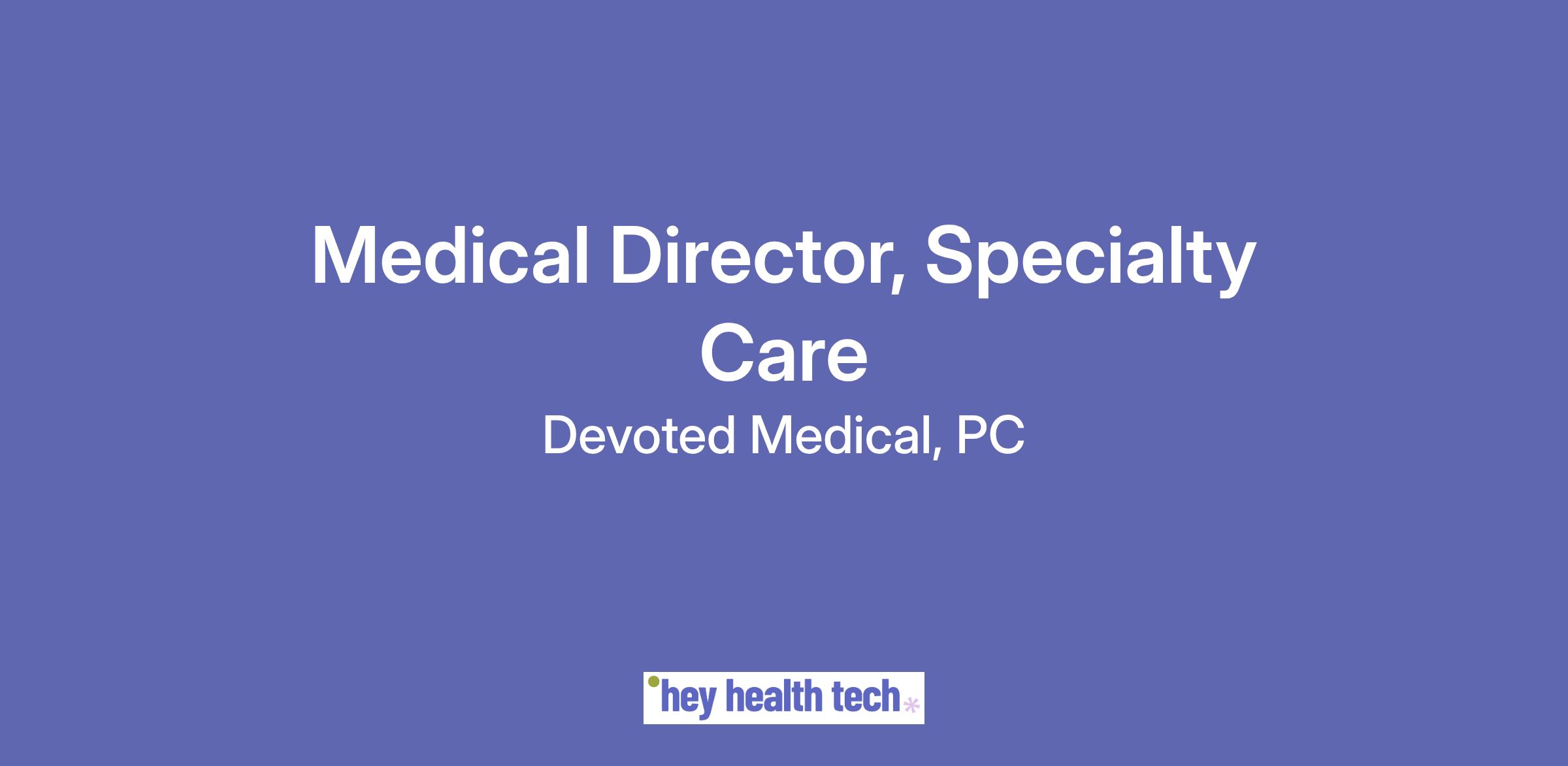 The Medical Director of Specialty Care will report to the Chief Medical Officer at Devoted Medical. The Medical Director will also serve as the clinical partner to the Senior Director for Specialty Care Operations, related to clinical model design, clinical oversight, and care team leadership.