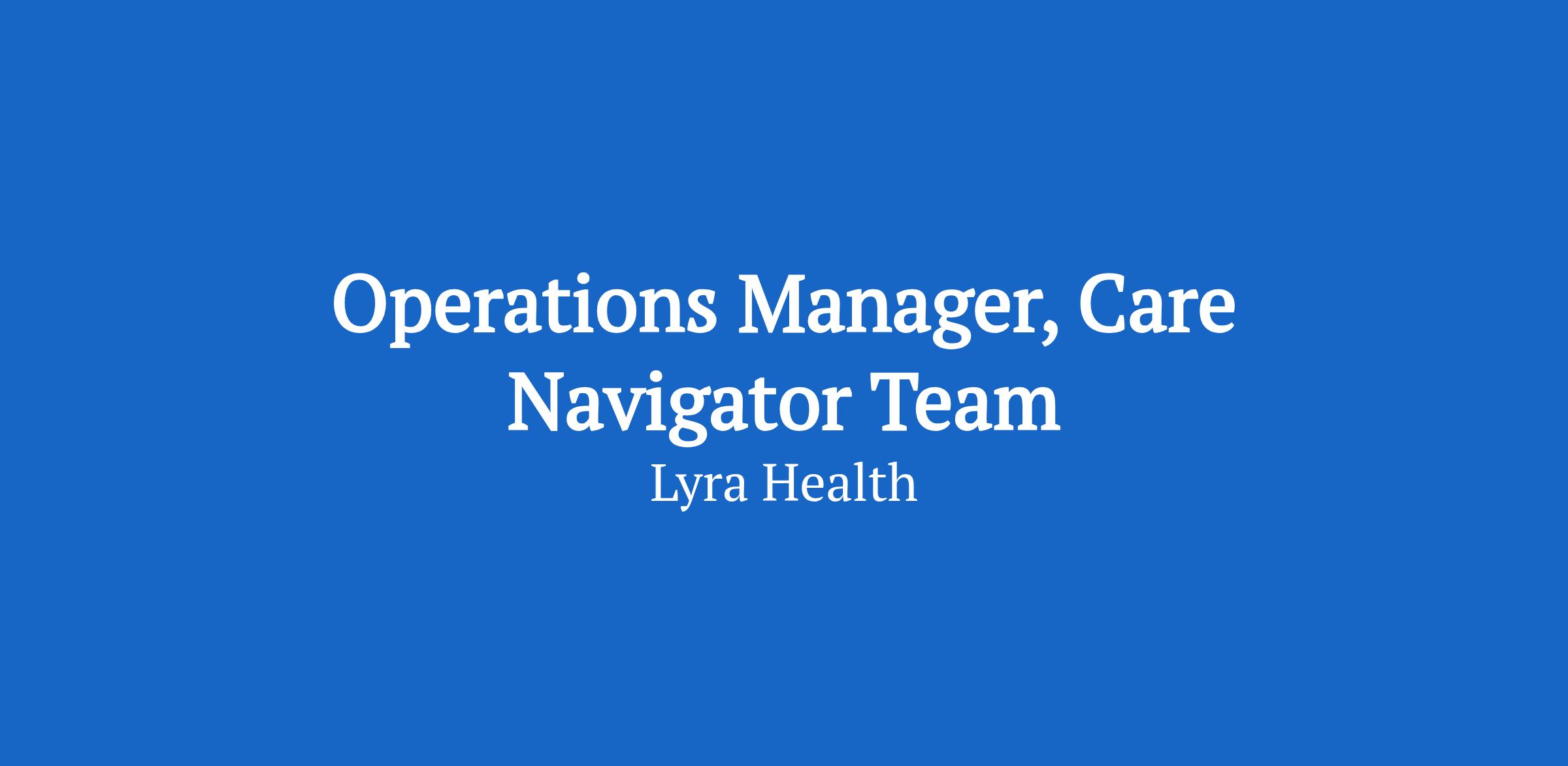Lyra Health is looking for an Operations Manager to help us grow and scale our Care Navigation offering to align with company goals and to continue to promote the value add of client-facing, access support services. This role will be a great fit if you are energized by leading a small team of project managers and interested in advancing service maturity through encouraging continuous improvement and innovation, managing projects, resource management, maintaining high service quality, meeting customer/client expectations and achieving departmental objectives. You should be a strategic problem solver who is highly organized, isnât afraid to dive into the details, and thrives in a fast-paced environment.