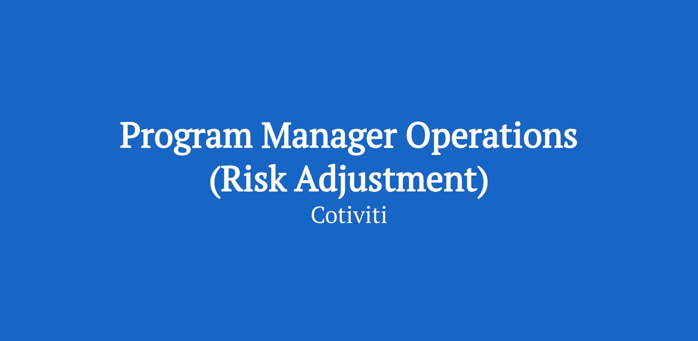 The Program Manager, Operations will partner directly with the assigned Client Executive, retrieval, coding, and reporting team leads and will focus on the execution and delivery of the Cotiviti Risk Adjustment Products and Services for enterprise-level accounts. The Program Manager, Operations will directly own assigned accounts and is responsible for overseeing all aspects of our engagement for our Risk Adjustment solution set. The Program Manager, Operations will leverage their deep healthcare and project management knowledge to deliver the highest quality of services to Cotiviti clients.